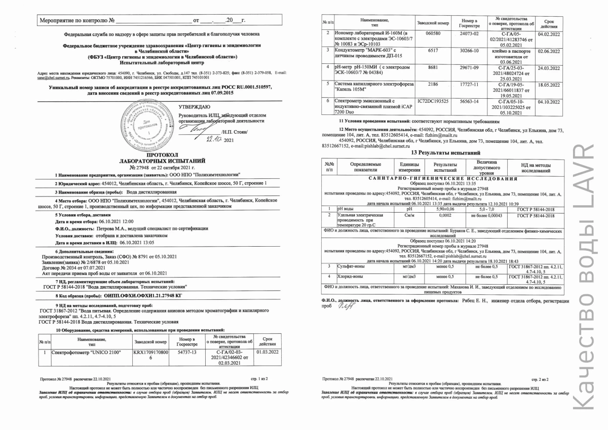 Общие Отсутствие примесей на уровне, превосходящем требования ГОСТ 58144-2018 Состав подтвержден результатами тестов Технические характеристикиТип товара: дистиллированная водаОбласть применения: универсальноеТип тары: пэт Дистиллированная вода высшей категории качества для обслуживания систем охлаждения ДВС и аккумуляторных батарей, разведения концентратов, использования в качестве омывающей жидкости. Вода изготовлена в соответствии с требованиями ГОСТ 58144-2018. Условия храненияХранить в вертикальном положении при температуре +2º до +30ºМеры предосторожностиНетСостав по этикеткеВода дистиллированная. Предназначена для обслуживания систем охлаждения двигателя и аккумуляторных батарей, разведения концентратов охлаждающих жидкостей и добавления в бачок стеклоомывателя. Подходит для бытового применения в парогенераторах, утюгах, моющих пылесосах, увлажнителях и очистителях воздуха. Может использоваться в специальном промышленном оборудовании.