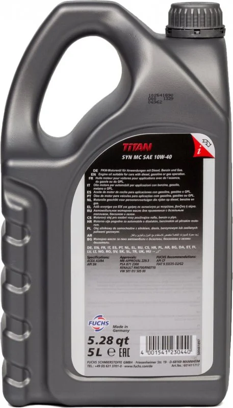 Моторное масло 10W40 полусинтетическое Titan Syn MC 5 л - это высококачественное моторное масло на базе МС-синтеза для всех бензиновых и дизельных двигателей легковых автомобилей и легких грузовиков, как атмосферных, так и оснащенных турбонаддувом.