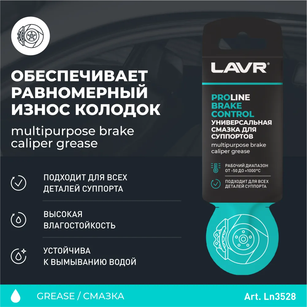 Общие Гарантирует подвижность и чистоту деталей суппорта Устраняет скрипы нерабочих поверхностей Защищает от коррозии Предотвращает заедания и заклинивание Облегчает монтаж и демонтаж в процессе ремонта тормозной системы- Обеспечивает равномерный износ колодок Рабочий диапазон от -50 до +1000°С Безопасна для резиновых манжет и уплотнителей Рекомендована к применению при каждомобслуживании тормозной системы Технические характеристикиТип товара: смазкаОбласть применения: тормозная системаПринцип действия: антифрикционная, консервационнаяОбласть применения: тормозная системаМатериал основы: синтетическаяАгрегатное состояние: пластичнаяТип тары: стик-пакет Высокотемпературная смазка для обеспечения подвижности деталей суппортов и исключения их заклинивания. Защищает поршень и направляющие от коррозии и загрязнений. Не вымывается, не пересыхает. Условия храненияХранить при температуре от -30 С до +50 СМеры предосторожностиОсторожно. При попадании в глаза или на кожу промыть большим количеством воды. При использовании применять средства индивидуальной защиты. Беречь от детей.Состав по этикеткеНа этикетке не прописан (Не противоречит ТР ТС 030) Перед применением тщательно очистить направляющие и пыльники. Для направляющих суппорта: Нанести слоем толщиной 0,1 мм на чистые обезжиренные поверхности. Для поршня суппорта: Нанести слоем толщиной 0,1 мм на верхнюю часть поршня под манжету. Для нерабочих и торцевых поверхностей колодок: Нанести тонким слоем на предварительно очищенную поверхность. Не использовать с тормозной жидкостью класса DOT 5.0. Не применять на рабочих поверхностях тормозных колодок и дисков.