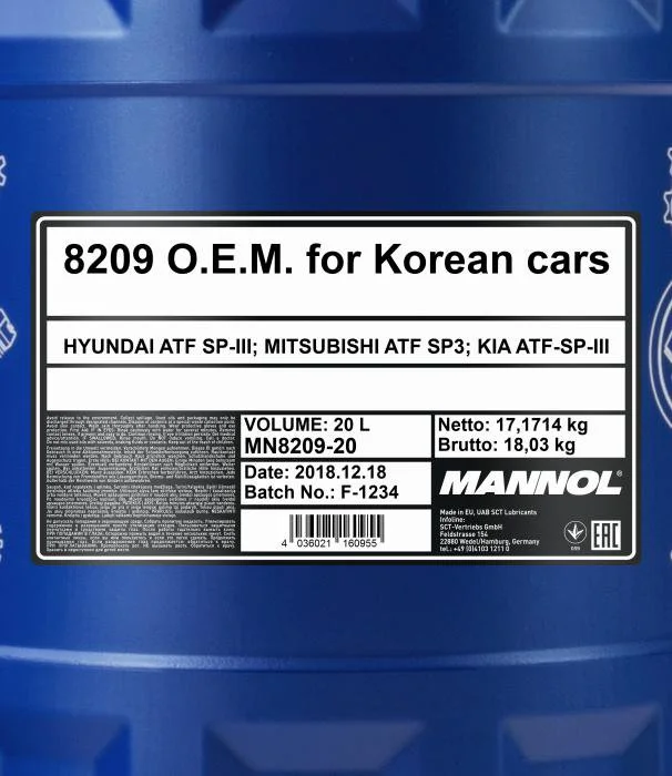 Масло трансмиссионное синтетическое 8209 OEM ATF SP-III 20 л - универсальное всесезонное масло высочайшего качества, разработанное для использования в автоматических коробках передач, для которых автопроизводители предписывают использование жидкостей ATF SP-III. Тщательно подобранные присадки и синтетические компоненты обеспечивают наилучшие фрикционные свойства в момент переключения скоростей, отличные низкотемпературные характеристики, высокую анти-окислительную и химическую стабильность на всем сроке эксплуатации.